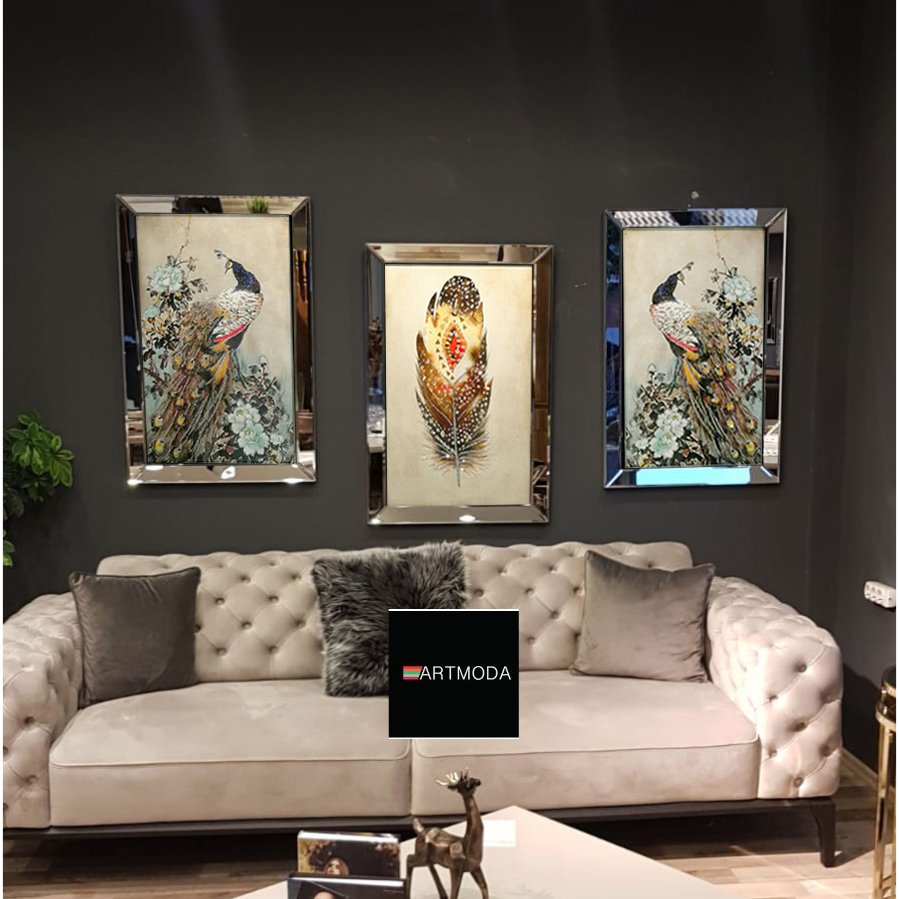 Ayna Çerçeveli, Tavuz Kuşu Tablo, 3 li Set 40 x 60cm