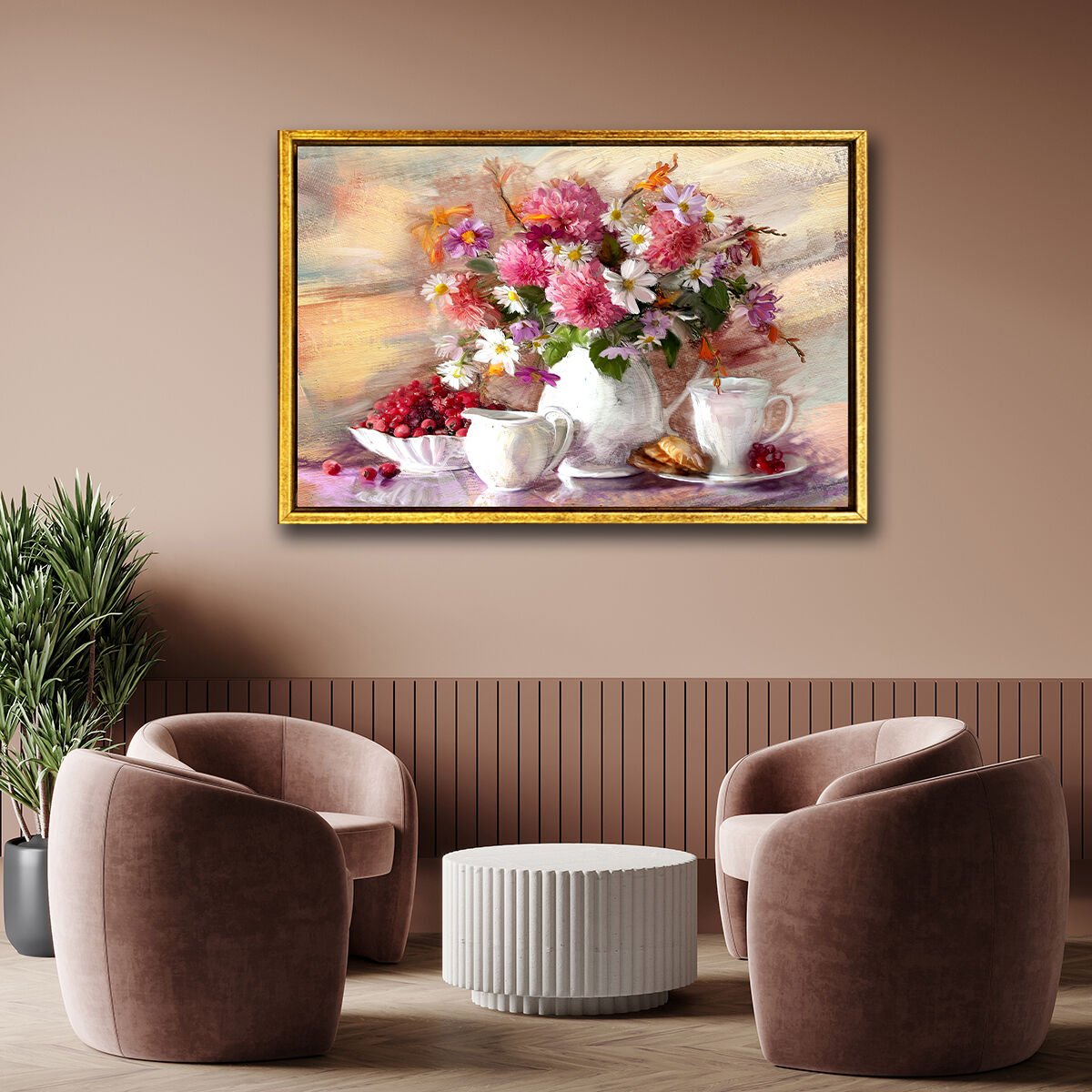 Çiçekli Kahve Molası, Yağlı Boya Dokulu Tablo