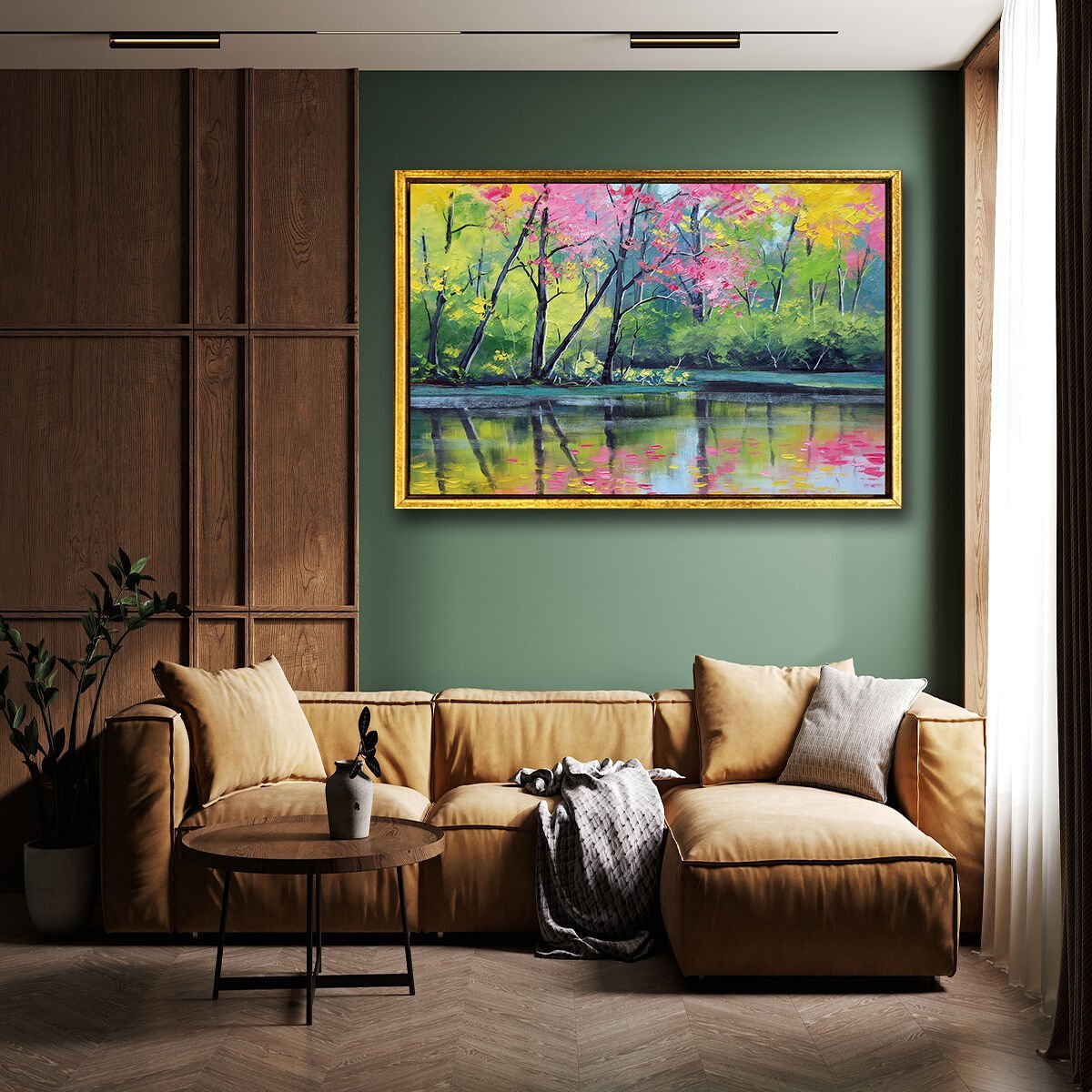 Göl Kenarında Renkli Ağaçlar, Yağlı Boya Dokulu Tablo