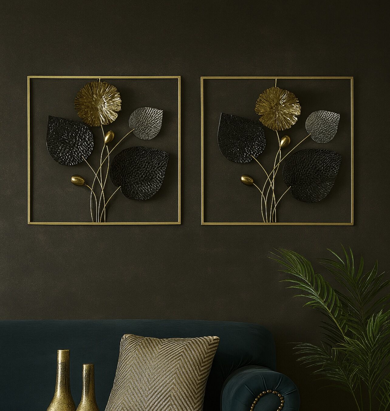 Dekoratif metal duvar panomuz 2li kombin şeklinderdir.