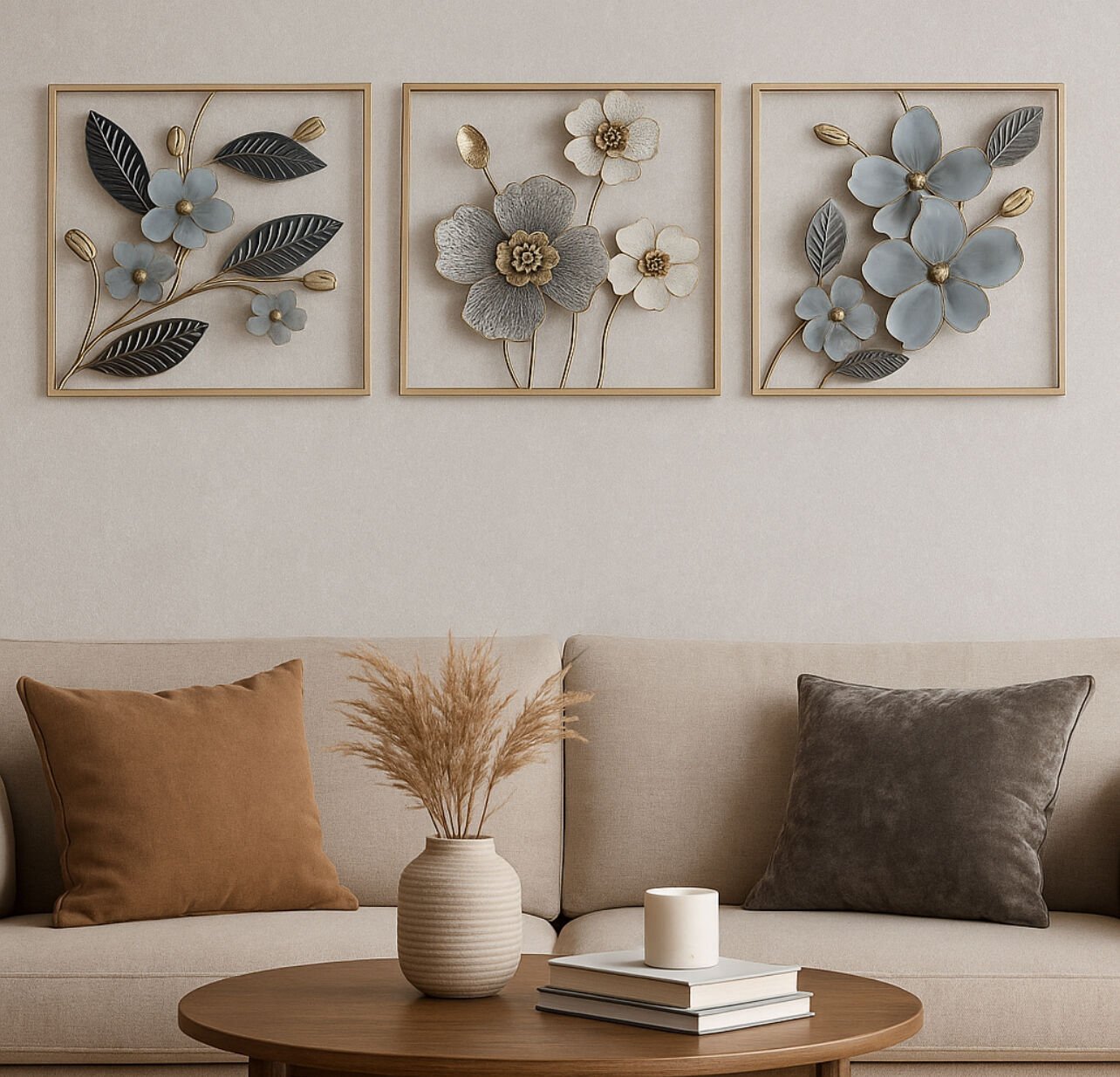 Dekoratif metal duvar panomuz 3 lü kombin şeklinderdir.