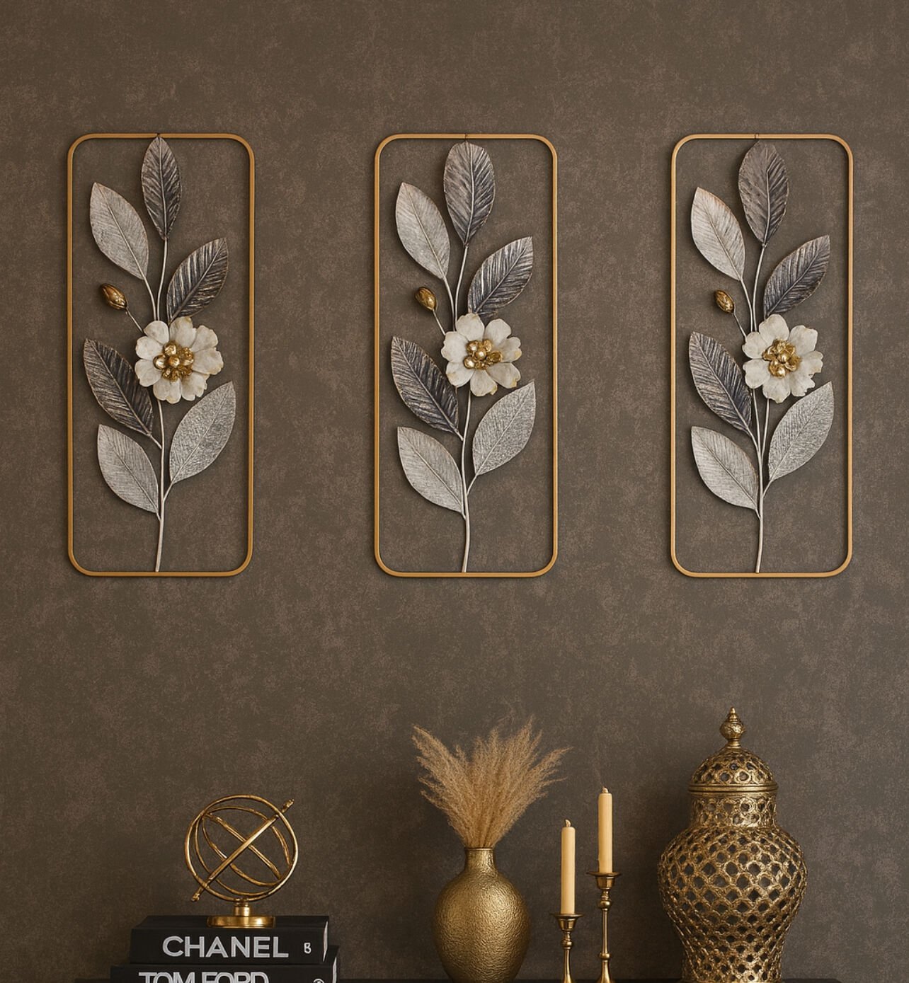 Dekoratif metal duvar panomuz 3 lü kombin şeklinderdir.