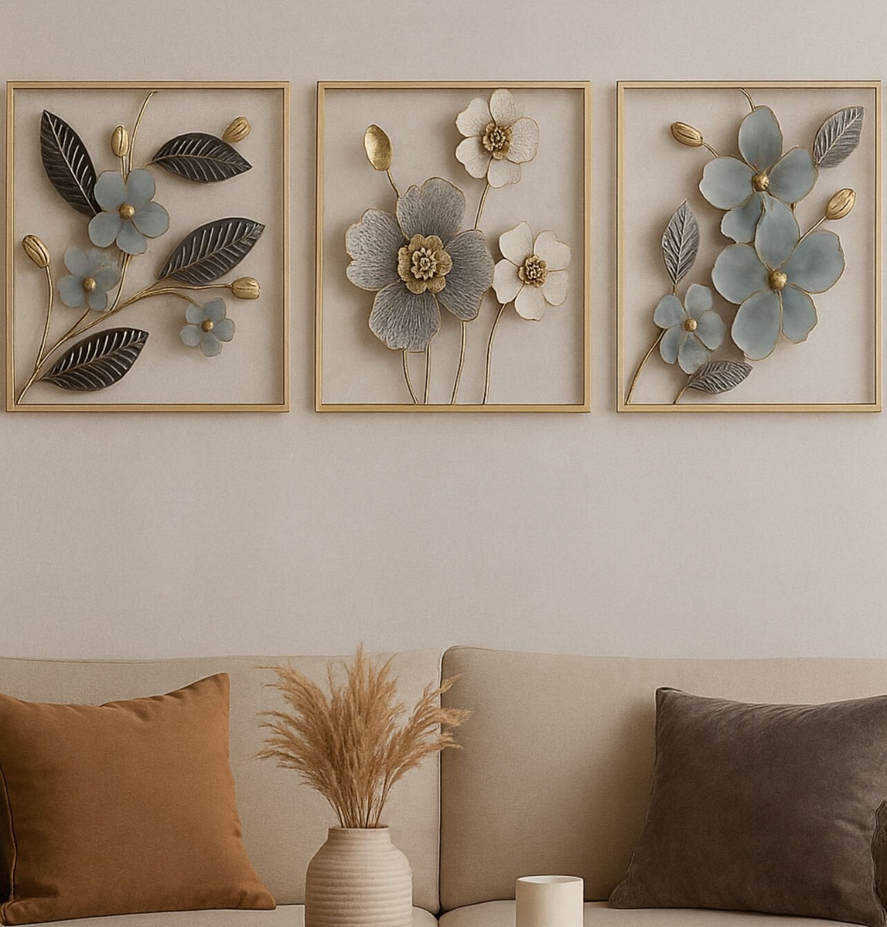 Dekoratif metal duvar panomuz 3 lü kombin şeklinderdir.